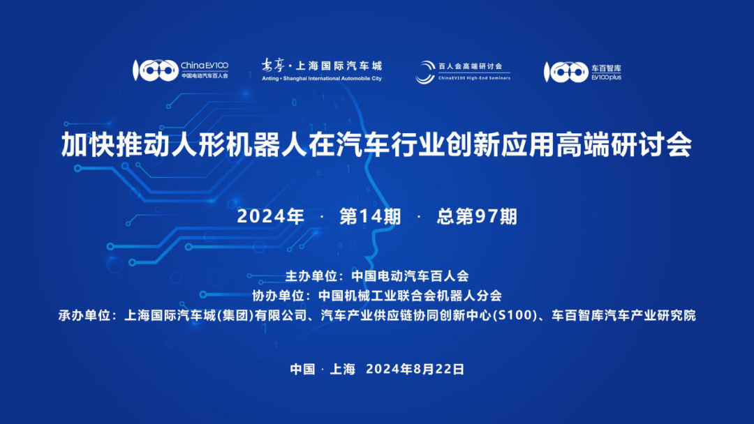 8月22日,由中国电动汽车百人会主办,中国机械工业联合会机器人分会协办,上海国际汽车城(集团)有限公司、汽车产业供应链协同创新中心(S100)、车百智库汽车产业星空xk共同承办的“加快推动人形机器人在汽车行业创新应用”高端研讨会,暨百人会2024年第14期(总第97期)高端研讨会,在上海嘉定顺利召开。研讨会由百人会副秘书长师建华主持。