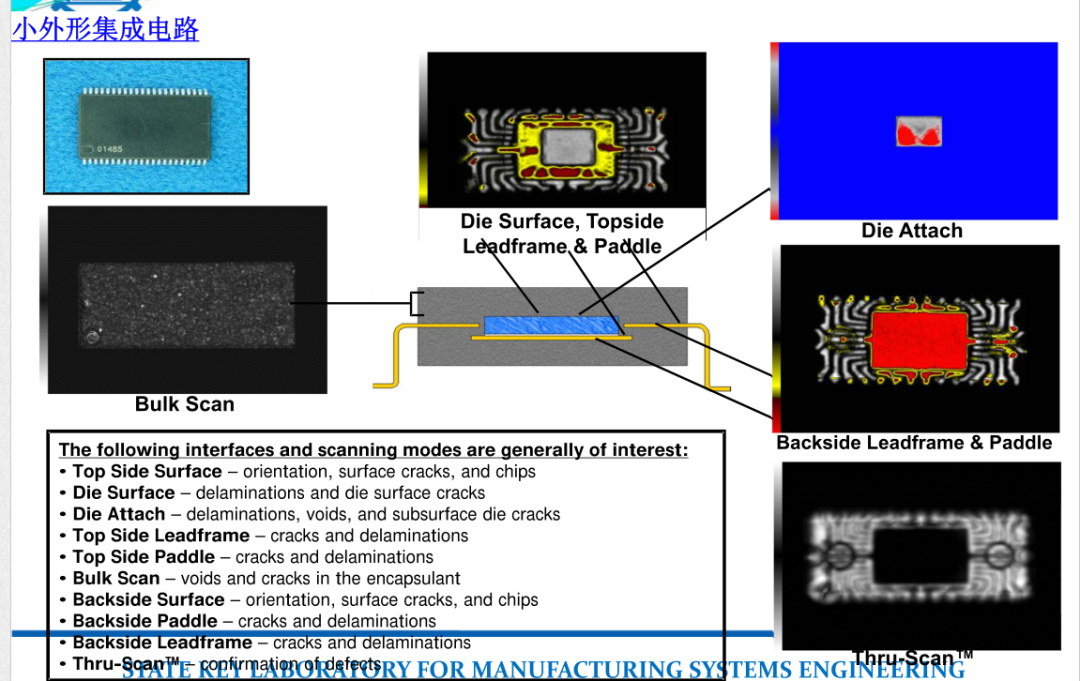 以小外形集成电路为例,利用超声扫描电子显微镜可以由表层至内部,针对不同深度不同器件(Surface,die,leadframe等)提供定位分析、空洞、分层、开裂及完整性分析等。