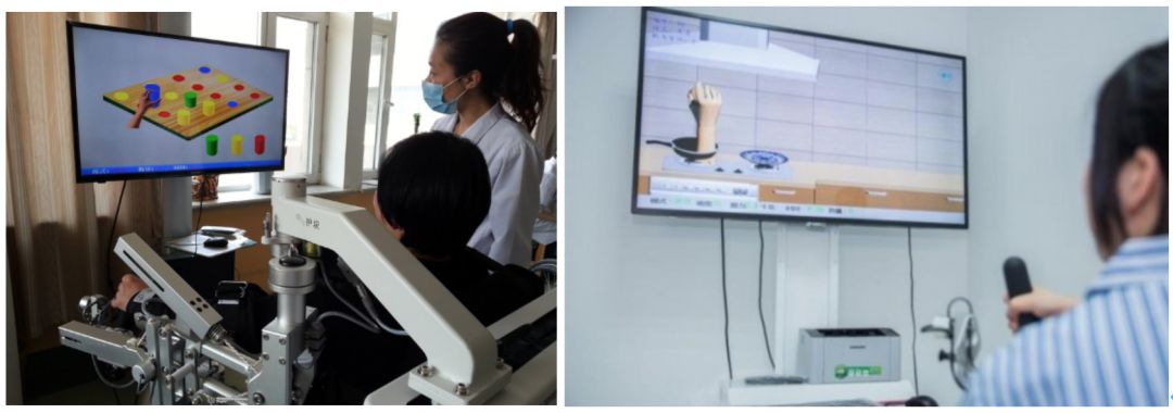 此外,双臂康复机器人通过与虚拟游戏的结合,提供一个娱乐的治疗方式,让患者通过上肢的运动来实时控制游戏中虚拟物体的变化,增加趣味性及主动性,并在上肢运动训练的同时,融合了图像识别、记忆逻辑思维等认知能力的训练,提升了认知能力、记忆能力、协调能力和本体感觉,最大限度恢复患者的脑神经功能,促进病人积极主动的参与到康复练习,大大提升了康复效率。